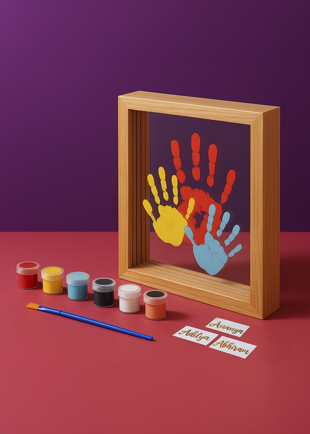 Love Layers is a handmade teak wood frame that turns your touch into timeless art. Designed for couples, families, and friends, each edition comes with crystal-clear acrylic sheets, premium non-toxic paints, and personalized name stickers — so every handprint becomes a lasting symbol of love and connection.